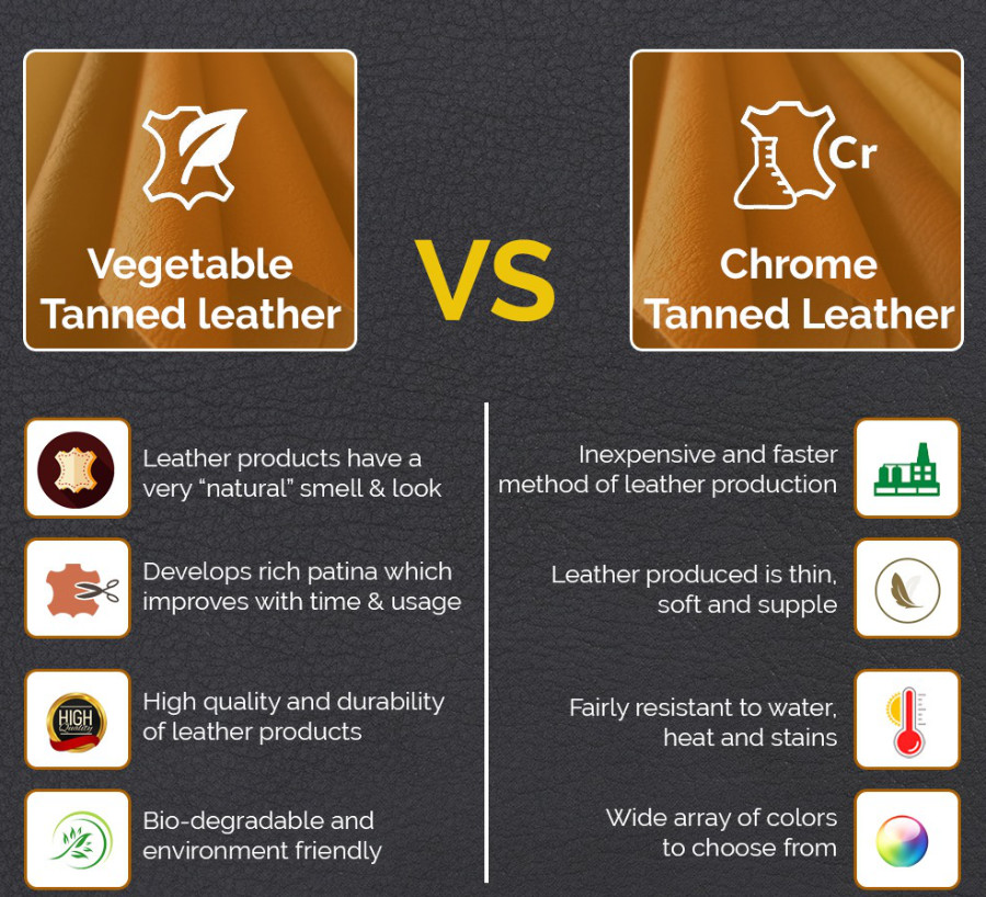 Chromium-tanned leather mostly used for jackets, upholsteries, etc. The advantage of chromium-tanned leather is you can choose out of endless number of colors, but is very dangerous to produce and can be give an allergic reaction to the skin. Vegetable-tanned leather has a more limited color variations, takes much longer to produce and is safe for your skin.