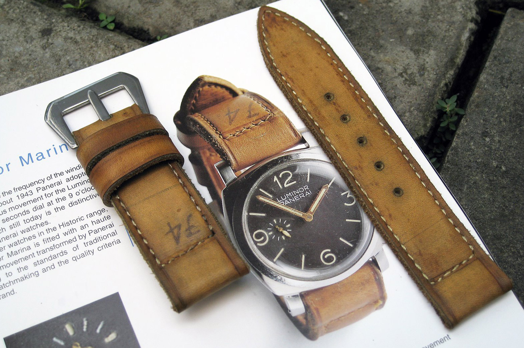 Most machine made straps including the the Panerai OEM straps can still be very nice straps with special materials and still created with care. Hand-made straps require a lot more skills, dedication and time as every single hole that needs to be punched very precise in the leather in order to sew the strap. A lot of hand-made straps are made of special materials like ammunition pouches or leathers that have gone through a very special process to make the strap look vintage, give it certain characteristics and style.