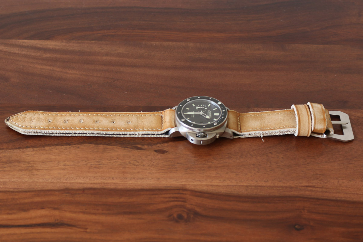 At 27mm wide and 6 mm thick with the triple fold technique on the buckle-side, this strap has impact and presence for any 47mm sub or historic PAM. The strap feels great on the wrist and looks even better on my PAM00526. The aged-tan color of the strap has a distressed and vintage look, but in a very subtle way. As a matter of fact, the colour may be the only subtle thing on this strap, but it's a colour that goes with any PAM, black dial, white dial, blue dial or brown dial.