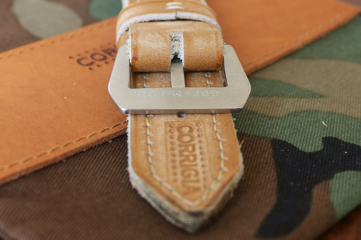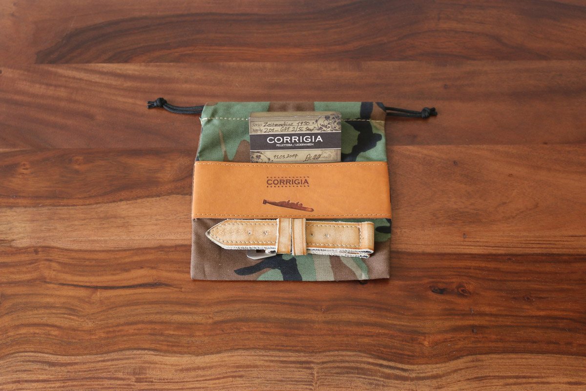 The strap came in a camouflage canvas pouch that is branded on a leather band with Corrigia and an SLC human torpedo, a nice detail. This pouch is bigger than the pouches I received with my other straps I got till date and can hold a lot of straps. My straps from Corrigia came earlier in a wooden box, not always very practical when it has to be shipped, they can break during transport of the package.