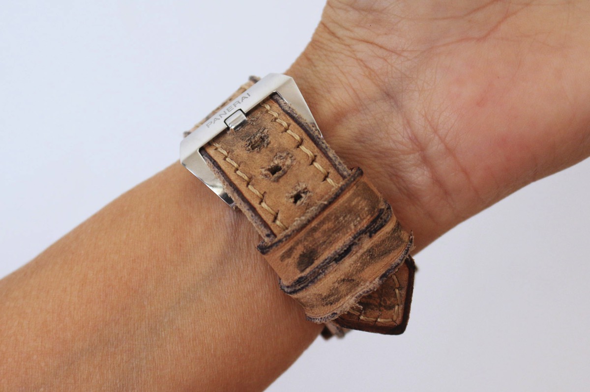 If you like to have the strap more character, you can request for an "Extreme Vintage treatment" that gives the strap a worn-out look without damaging the strap or giving it a bad smell, the strap smells absolutely new. That is exactly what she was looking for, she wanted a strap color that matches her PAM00512 and at the same time needs to look distressed. There are eight different color choices and the color that would suit her best was no. 7, the only one that does not have a vintage distressed finish, Cengio offered the mentioned "Extreme Vintage treatment".