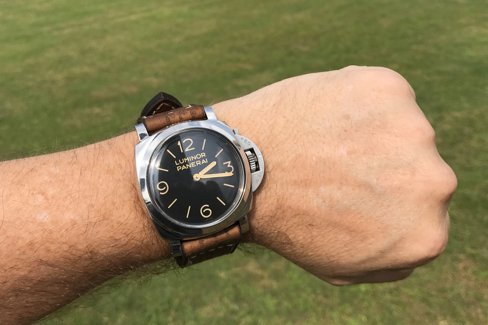 The strap fits tight on the case and between the lugs and looks elegant and at the same time sporty. There color of the strap is rich dark brown and the stitching blends in very well with the faux-patina of the PAM372.