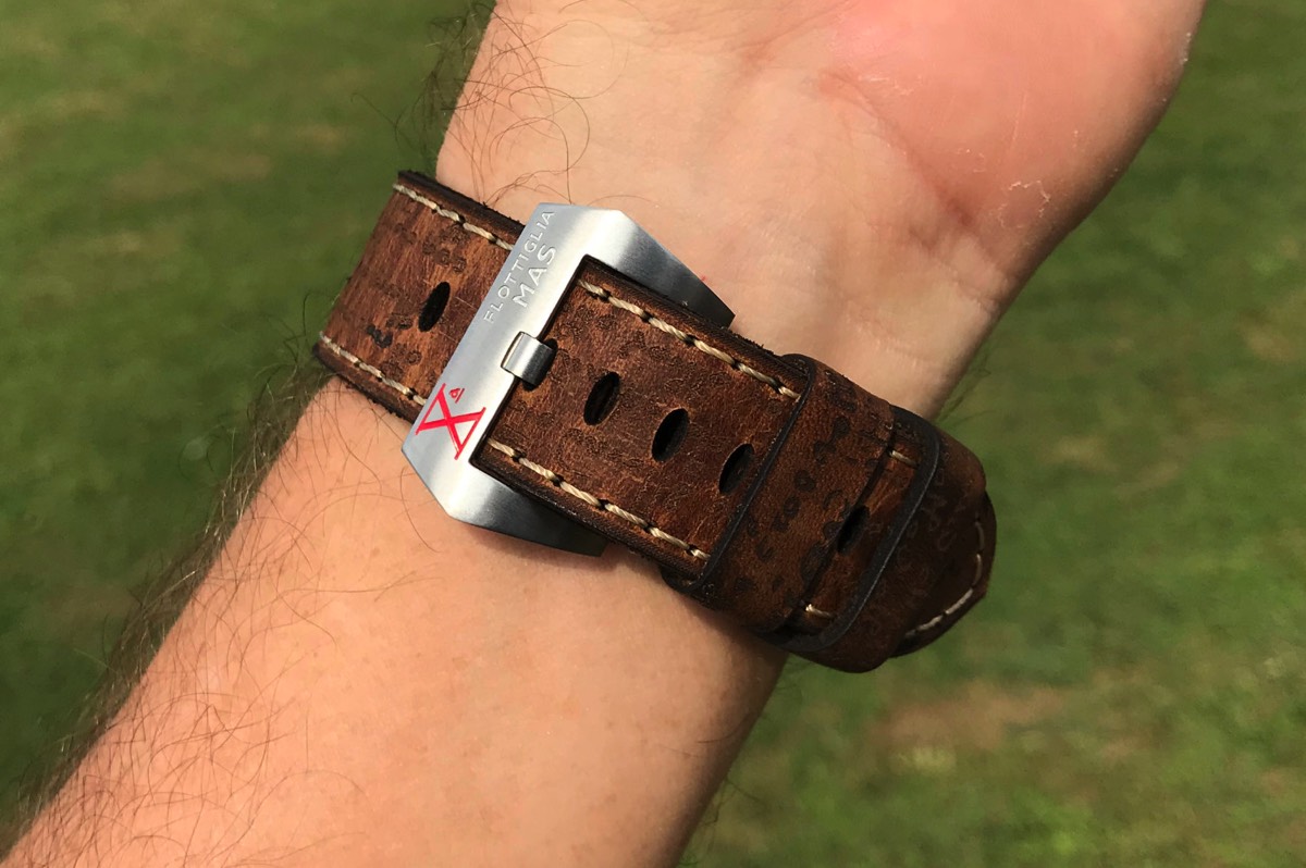 The finish of the strap is sharper than his other straps, the sides are clean, the tail has a more OEM style rounded tip and when you take the strap in the sun it has an oily shine to it. There are already tubes installed, very convenient! The holes punched are the oval style one similar like you see at Panerai OEM straps. As this strap is thicker than the OEM straps, it feels firmer on your wrist. The strap is very soft and has had a different vintage treatment than other Corrigia straps. The Voynich script is written on both the front and backside of the strap, you can actually decide if you like the the line "Manoscritto Voynich" visible or not as both sides can be used here.