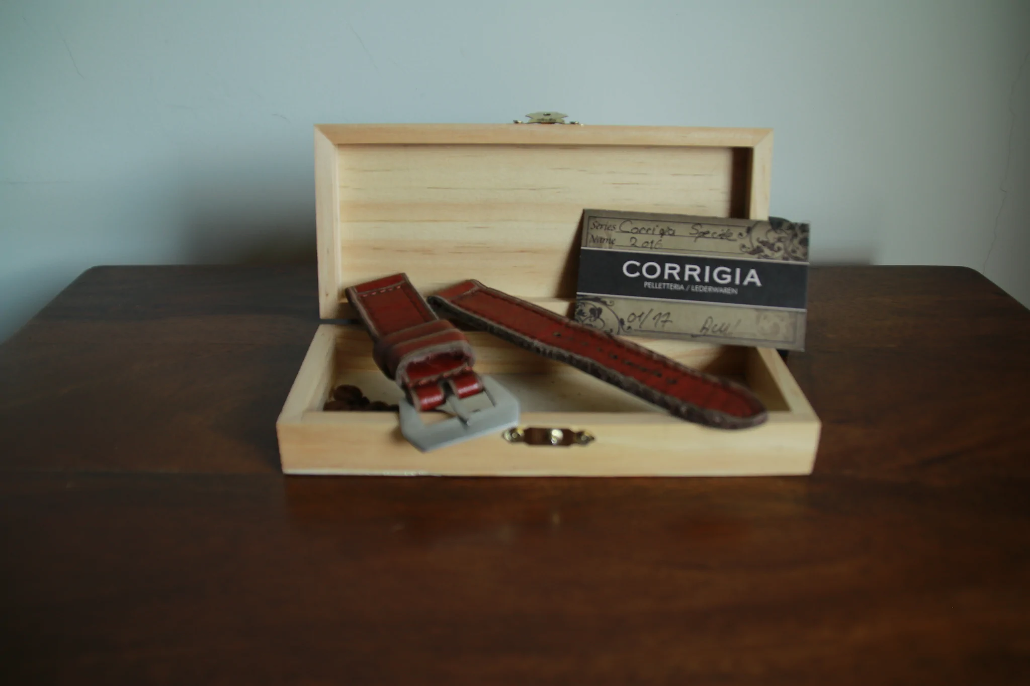 Corrigia has been creating wooden boxes for individual strap series. The box this strap came with is stamped with the Siluro a Lenta Corsa (low speed torpedo) - AKA PIG. Next as this is a limited edition strap, there is a card included with the name of the strap and the serial number 01 of 77. To keep the strap smell nice, you will find coffee beans added.