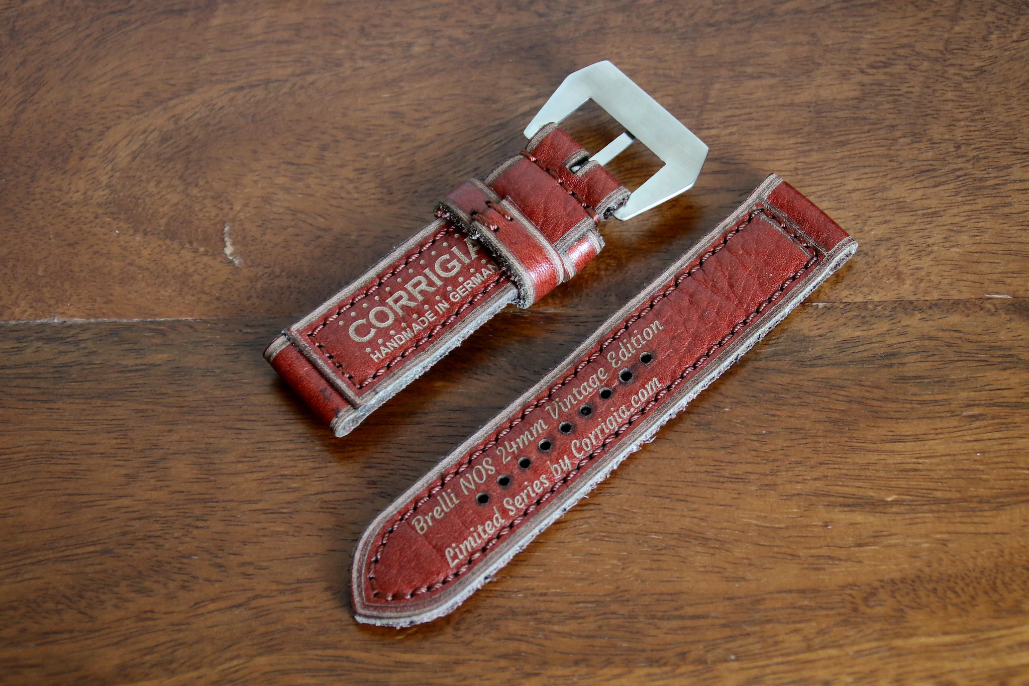 This strap is produced in Brelli style, as in the 1950s by Bruno Bartalucci (Cuoierie Meccaniche Brelli) from Castelnuovo d'Elsa, Tuscany. Italy. Orginially they were sewn with a Nechi 902-156 industrial sewing machine. The distance from the seam line to the edge of the strap is very wide at 4.5mm due to the edge ruler from Nechi. Corrigia has taken all these characteristics in consideration and re-created this completely hand-made!