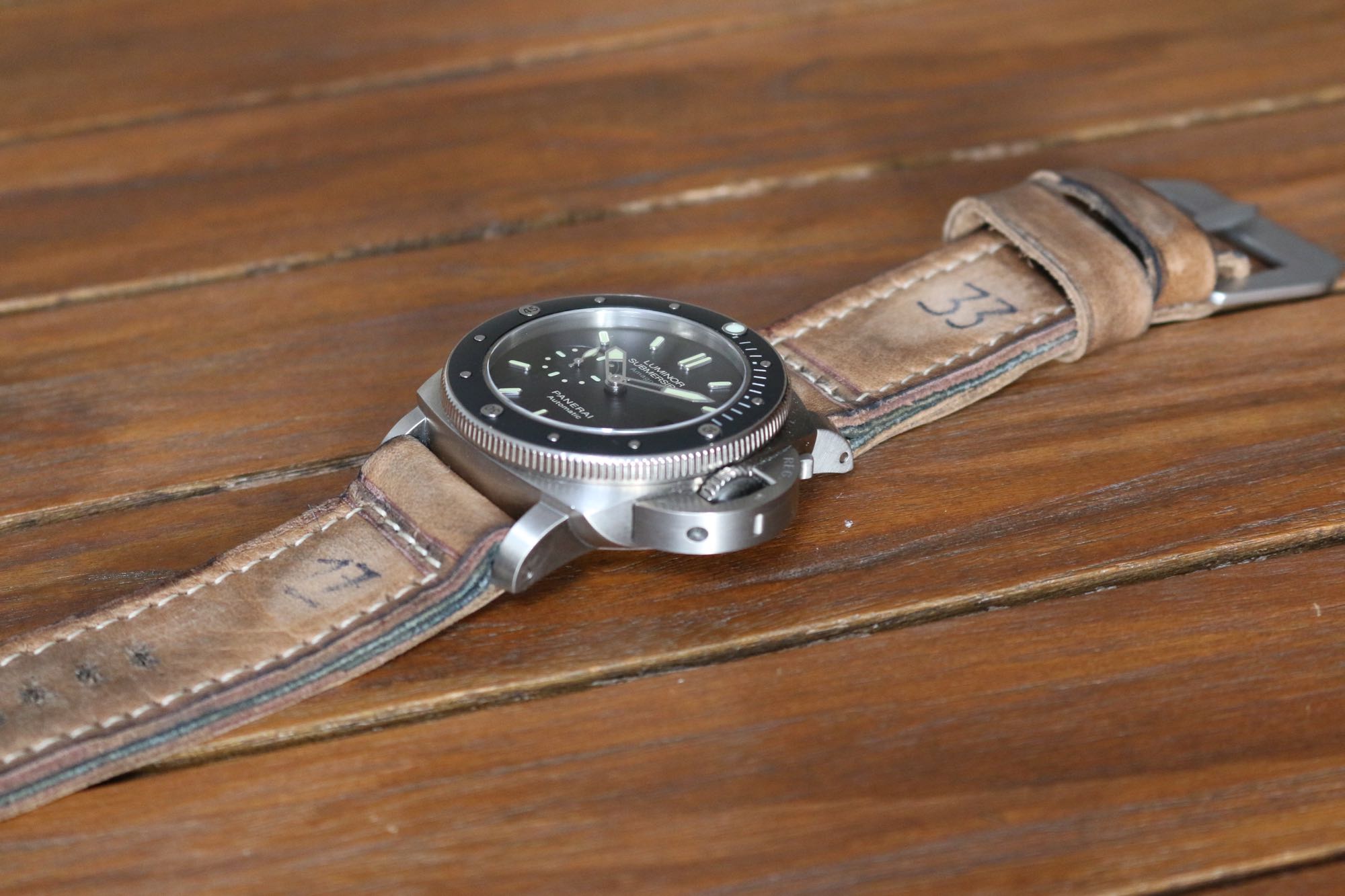 Both the straps are tight against the watch case due to the thickness of the strap and the extra 1mm width. The Fletch04 gives a beautiful contrast with the PAM00327 and the ecru stitching works fine. The L15 looks fantastic on the PAM00389 and gives the watch a complete nice bulky look and feel . The numbers "17" and "33" on the strap reminds of the time the Italian Navy numbered all their equipment and makes the watch look ready for combat. The black filling layer complements the watch ceramic bezel and the sandblasted buckle looks similar to the brushed titanium case of the PAM00389.