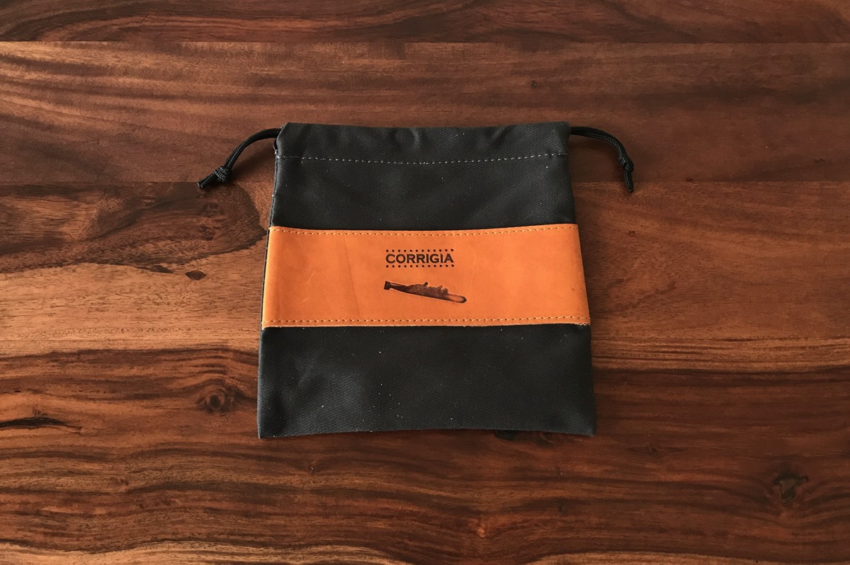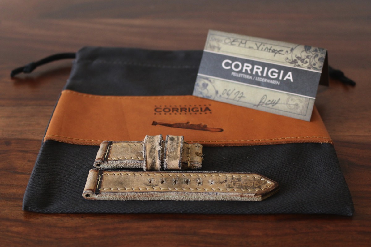 The strap came in a canvas pouch that is branded on a leather band with Corrigia and an SLC human torpedo, a nice detail. This pouch has the same dimensions as the one I got with my Zeitmaschine strap.