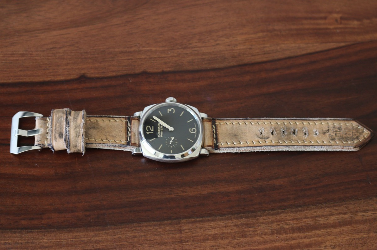 The finish of the strap is comparable to the Roger Blue LE, the hand-stitching is again well done. The leather is extremely soft and has sort of a silky feel to it, just like the Roger Blue LE. This strap also got with the "Extreme Vintage treatment" the salt water & leather balsam treatment, the burnishing is absent, the sides are a bit rough but less rough than my Corrigia straps, the lining of the strap is the same leather as the upper side of the strap and the extra layer in-between at the lug side is a lighter tone the upper layer. The strap thickness is uniform. The lugs are done to tightly fit either the tubes or the thicker pins of a PAM00512. The strap came with tubes installed and I had to take them out when fitting it on the PAM00512. The stitching is sharp and straight. The vintage and worn look gives the strap many different shades of brown/beige and has a nice character, more extreme than my Corrigia Zeitmaschine strap. It has the color differentiations by grinding and polishing and has not been recolored, this keeps the leather free from toxic substances.