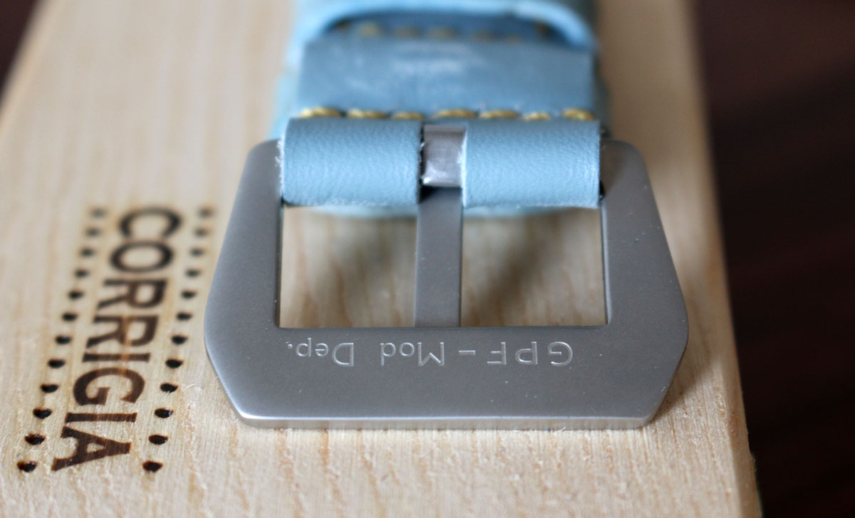 The finish of the strap is very good, the hand-stitching well done. The leather is extremely soft and has sort of a silky feel to it most probably due to the salt water & leather balsam treatment, the burnishing is absent but not as rough as my other Corrigia strap (Squadra01), the sides are rough, the lining of the strap is the same leather as the upper side of the strap. The strap thickness varies, at the lug side it is thicker than on the buckle side, because of the "true vintage technique" as Cengio calls it. On one side the very clean modern light blue color and the vintage worn look makes this strap a perfect strap for the summer. The maker stocks for every strap he makes separate leather hides. The calf leather that is used for this strap has therefore not been re-colored to make sure the leather remains free of toxic substances.