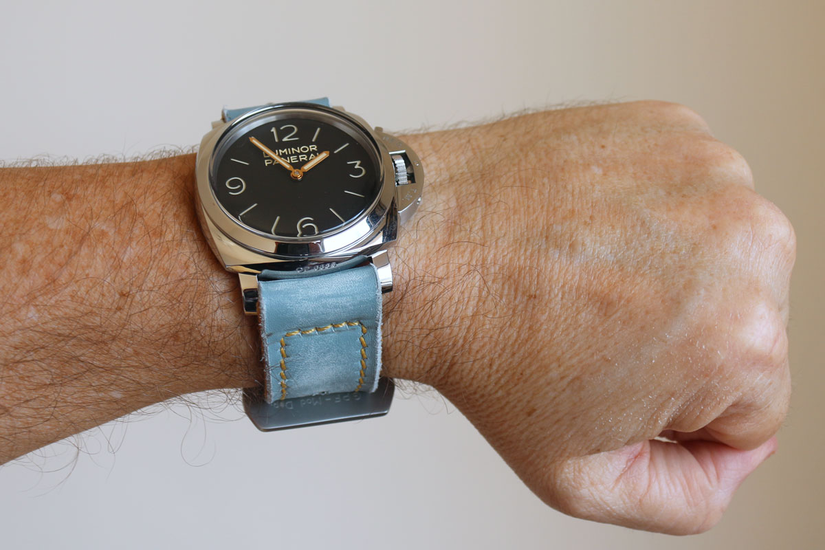 It's time now to put the strap on the watch. With my PAM00372 it is an easy task to do with the screw-in pins, but takes longer than with the quick-change strap system of my PAM00389, still no need to visit a watchmaker to do it for you. But the first time you put on a strap that is 1 mm wider than your lug size of the watch and the leather is as thick and rough burnished like this Roger Blue LE strap, you will need to put a bit of more effort to get it on the watch. This will be easier after you have worn it a few times.