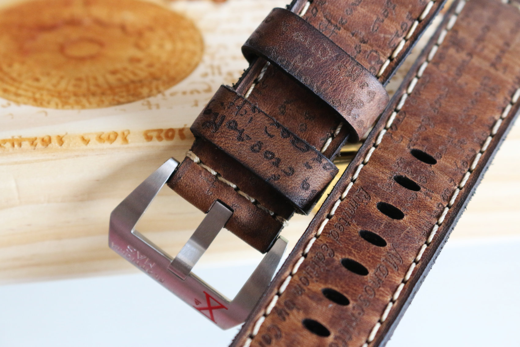 The finish of the strap is sharper than his other straps, the sides are clean, the tail has a more OEM style rounded tip and when you take the strap in the sun it has an oily shine to it. There are already tubes installed, very convenient! The holes punched are the oval style one similar like you see at Panerai OEM straps. As this strap is thicker than the OEM straps, it feels firmer on your wrist. The strap is very soft and has had a different vintage treatment than other Corrigia straps. The Voynich script is written on both the front and backside of the strap, you can actually decide if you like the the line "Manoscritto Voynich" visible or not as both sides can be used here.