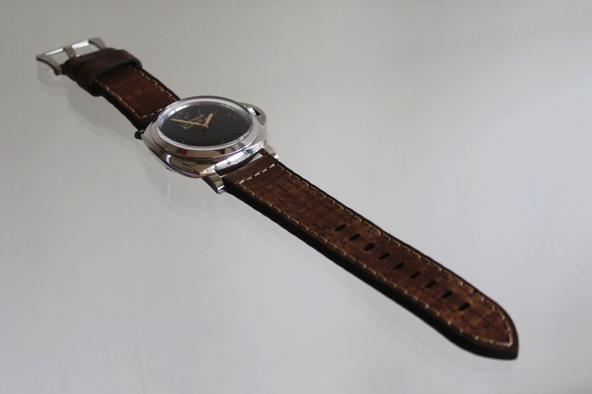 A very well-know Panerista made an original old strap available that was mounted on his vintage Panerai Luminor Ref. 6152/1 and allowed Cengio to take the strap apart in order to study the building structure and design of the strap and renew the stitching. He did something more than that by making a 1:1 replica of the strap that he called Corrigia Reborn 1960 Fletch01.